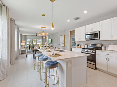 This single-story home features a smart layout that prioritizes ease of living. Down by the foyer is an open-plan design shared by the kitchen with a center island, dining room and family room, which extends out to the covered lanai. On the opposite side of the home are two bedrooms to provide a restful retreat and a den well-suited for as a private office. At the front is a versatile two-car garage.Photos are for illustrative purposes only.