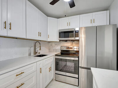This beautiful recently updated 1 bedroom 1 bath 2nd floor condo is located in an active 55+ gated community called Century Village in West Palm Beach. The Kitchen has white shaker cabinets with quartz tops and stainless steel appliances. Other features included are a pantry / closet located across from the full bath that has a tub/shower combo, new a/c, beautiful marble floors thru out, slider from the master bedroom that leads to a covered and enclosed porch to enjoy relaxing in. Camden N is a nicely maintained building and is located near the pool. Century Village is located near local shopping, restaurants, golf, tennis, boating, fishing, beaches, palm international airport, Kravis center for shows and concerts and so much more