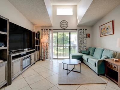 Lovely 2 bed/2 bath condo, located on the 3rd floor with vaulted ceiling, lots of natural bright lighting, tile throughout, and stunning views of the serene lake with fountain in an all age community. AC 2023, Kitchen Appliances 2022, Water Heater 2019, roof 2023. This gated community has a fenced in pool, clubhouse, tennis/pickle ball court, and tons of guest parking. (1) assigned parking space and guest spaces available. No Lease first 2 years. Great central location close to I95, turnpike, outlet mall, downtown, and the beach. Monthly HOA fee includes basic cable, internet, and water.
