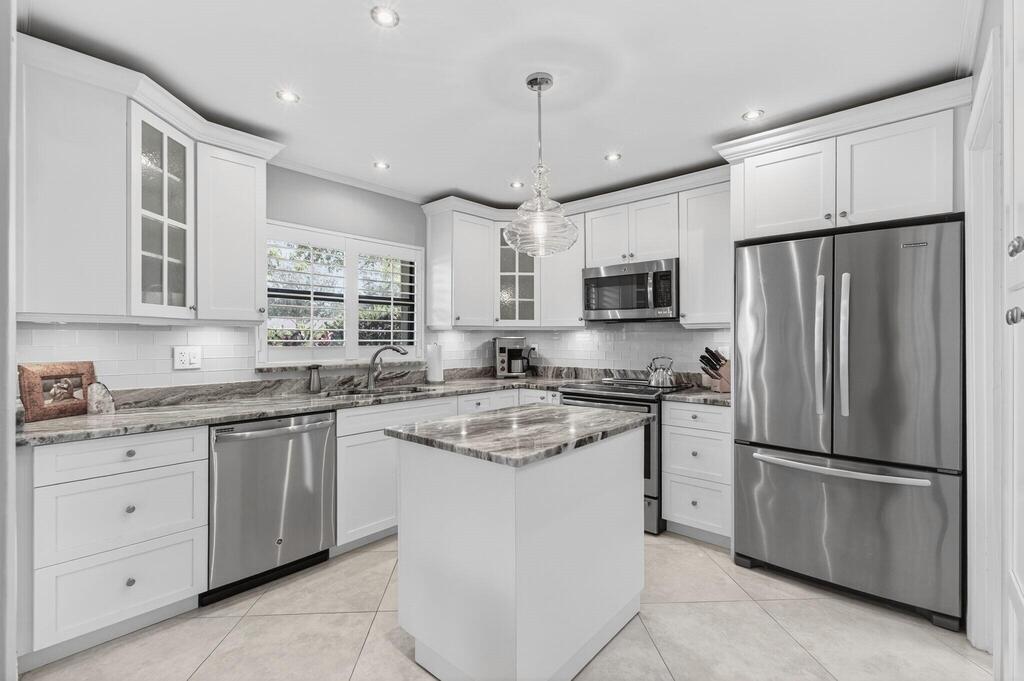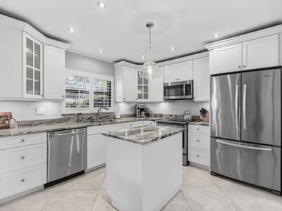 Pride of ownership is evident from the moment you step into this completely renovated 2BR/2BA 1-car garage villa. This corner villa features: Currently renovated kitchen in designer colors with shaker white wooden soft-close cabinets, New SS appliances, pantry, granite counters with subway tile backsplash, and movable kitchen island. AC May 2025, Recessed lighting in kitchen and living room, 24x24 Neutral tile on the diagonal throughout, New windows with accordion shutters, impact sliding glass door in Florida room, knock down textured ceilings (no Popcorn), garage has tile flooring, full-size washer and dryer with laundry tub, plantation shutters on all windows, finished attic with plywood floors and shelving, custom extended driveway recently resurfaced, updated crown molding and 7''