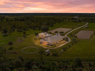 Set on 21.59 acres in the exclusive community of Trailside, this property combines established equine facilities with the opportunity to create a true luxury estate. This property's centerpiece is a nearly 5,000 sq ft CBS barn with 11 stalls, tack & feed rooms, and a guest house, all built in 2019 with hurricane-rated construction, rebar-reinforced walls, and modern engineering - providing a safe, secure living and equestrian environment. The barn also offers flexibility to convert part of the space into a custom residence if desired. A designated homesite is ready for a main residence, with underground power already installed, offering the chance to build a luxury estate. This private, secluded property is fully fenced & cross-fenced with multiple pastures & paddocks. Full-pro