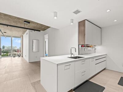 Flawless 2025 renovated 2BR/2BA at The Edge. Condo features mocha limestone honed floors, all new doors and drywall, seamless lighting, and bathrooms with natural stone and frameless glass showers. Both bedrooms have Container Store custom closets. Condo includes reverse osmosis water system, new AC, dehumidifier with pump, and plasma air cleaner. Kitchen boasts Viking stove top, custom-paneled Fisher & Paykel fridge/dishwasher, and Miele washer/dryer. Bonus built-in nook/workstation. Private balcony with city views. Amenities: rooftop pool/clubhouse, fitness & business centers, 24/7 security, lobby, 2 garage spots. Walking distance to downtown restaurants; easy access to PBI, Tri-Rail, and Brightline.