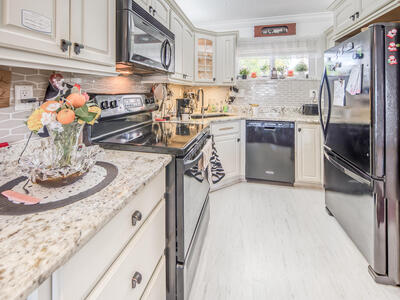 You've come home! This 55+ Lake Clarke Gardens 1 bedroom, 1,5 bathroom condo is the perfect home for the aesthetic lover. The living room opens to a bright patio with opening impact windows. Beautiful natural white kitchen with a granite counter tops opens to the cozy living room. Nice office nook in the bedroom. The laundry with brand new washing machines is located close to the apartment. Some of the furniture are for sale with the apartment. AC installed 2024. Water heater is about 6 months old. Almost new fridge. Very well kept apartment.
