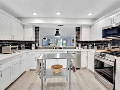 Stunning and completely renovated first floor condo with tremendous kitchen, bonus two walk in closets,High end appointments and both a screened covered patio and an outdoor patio! Water views in front and back. Could add a closet to make 3 bedrooms or keep the oversized office. Low fee with a COA that includes almost everything! Grills allowed on outside space only first floor units have this!