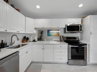 Corner unit with water views and extra natural light! IMPACT WINDOWS. Fully updated with sleek ceramic tile--NO carpet! The kitchen shines with granite counters, white subway tile backsplash, stainless LG appliances, and a pass-through to the dining area. Bright living space is ideal for relaxing or hosting. Both bathrooms are stylish and spotless. Screened balcony overlooks the water--perfect morning spot. Walk to clubhouse, pool, and more! Guard-gated 55+ community offers a cafe, gym, tennis, sauna, heated pool, hot tub, and year-round activities. One pet allowed, up to 30 lbs. Furnished by a professional designer--all furnishings negotiable. Best unit in Golden Lakes! Don't miss it!