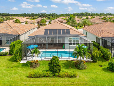 Enjoy luxury living in this beautifully upgraded 3,000sft home, located in prestigious PGA Verano golf community. Step inside to discover a bright open floor plan fully tiled throughout, enhanced by crown molding and custom wall moldings in the dining room and den. Plantation shutters, upgraded fans, and designer light fixtures add a refined touch throughout the home. The spacious open-concept kitchen features a massive quartz island, sleek white cabinetry, wall oven, and stainless steel appliances--a chef's dream and an entertainer's delight. Enjoy outdoor living year-round with the screened-in pool with solar-heat and electric heat backup! The expansive lanai affords privacy complete with electric-powered storm screens for added weather protection. This property backs up to a wide canal
