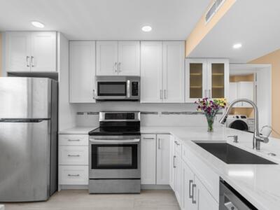 Stunning, private, renovated 2bed/2bath corner top 4th floor unit with pool and lakefront views. This unit has a bonus space that could easily be a den or home office. Immaculately maintained, porcelain wood inspired flooring, custom cabinets, quartz countertops and new appliances. Impact windows. Excellent location, AAA schools, minutes from parks, beaches, fine dining & shopping. Approximately 25 minutes from the Palm Beach & Ft Lauderdale International Airports.