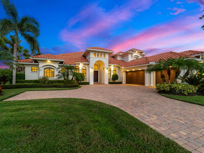Welcome home to this exquisite 5-bedroom, 5-bath luxury estate located in the prestigious gated waterfront community of Ravello. Designed with timeless elegance and exceptional craftsmanship, this home offers both grandeur and comfort across every detail. From the large 24'' x 24'' porcelain tile throughout the main living areas, to the vaulted tray and coffered ceilings - every detail of this home is built to impress. The expansive main-level owner's suite provides an oversized private bath with dual spacious California custom walk-in closets. All four of the additional bedrooms feature private access to an en-suite bath for ultimate convenience.