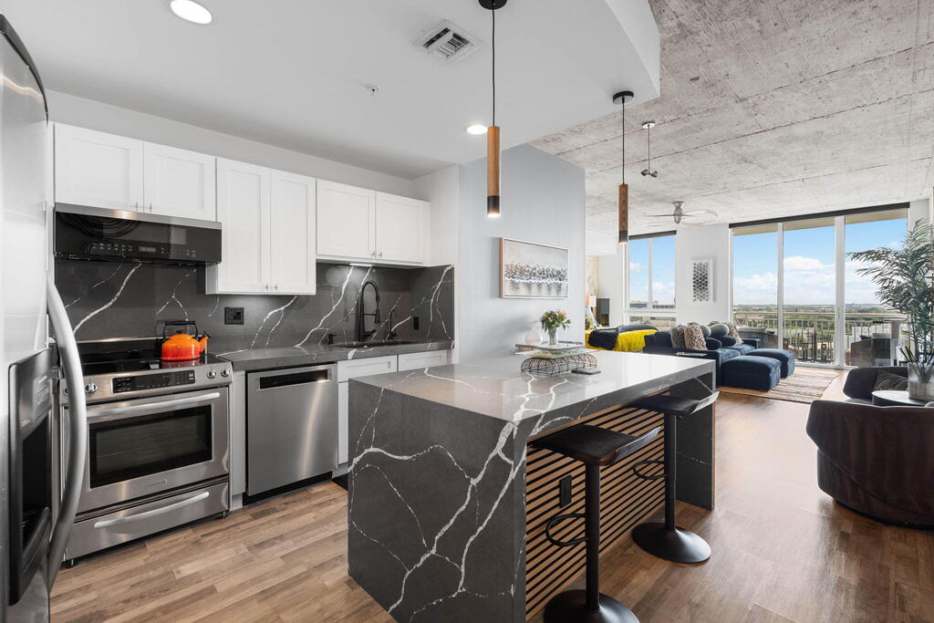 RARELY available TURNKEY GEM! 1BED/1BA w/ Triple Water Views of Ocean, Pool, & Clear Lake!! Most Popular & Largest 1 Bed Floor Plan at the Highly Desired Edge Condo. Spacious & Beautifully FURNISHED with all designer furniture - custom Restoration Hardware. INVESTORS DREAM or your dream home! Private Balcony. 12ft ceilings. Stylish Exposed Concrete. BRAND NEW GORGEOUS FULLY GUT RENOVATED throughout. W/D in unit. Rent right away, up to 12x per year. Brand New Construction next door and major plans for ''Transit Village'', centered around The Edge. Fully funded reserves, no pending or special assessments. Recently remodeled circular driveway, fitness center, repainting/maintenance of entire building exterior complete. 24 hr concierge, resort style pool deck. Pets welcome. Brand new Bosch AC
