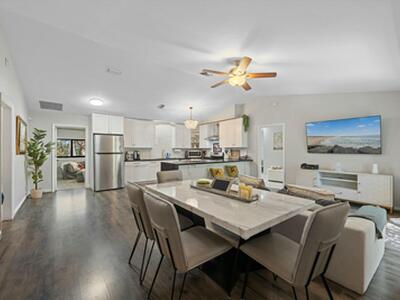 This 3 bedroom + movie room, office/den, 2-bath home on 1.29 acres in The Acreage is the perfect blend of modern style and serenity. The open kitchen features shaker cabinets, new electric appliances, and a wine cooler, while the media room--with a Murphy bed and electric fireplace--offers a cozy, multifunctional space. The spa-inspired primary bath includes a walk-in shower and two-person jacuzzi tub.Step outside to your own private oasis -- a lush, green haven designed for both relaxation and recreation. Lounge by the screened-in pool, surrounded by mature trees and the peaceful sounds of nature. The expansive backyard offers endless possibilities, from playing under the fruit trees to unwinding in a hammock by the pond. For equestrian enthusiasts, the two-stall barn