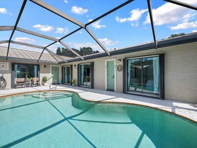 Experience Florida living at its finest in this stunning single-story corner unit townhome in the highly desirable community of Westwood Gardens. Enjoy gorgeous lake views, breathtaking sunsets, and the comfort of private pool living with a screened-in patio-perfect for relaxing and entertaining all year round. This 3-bedroom, 2-bath home offers a spacious split floor plan with vaulted ceilings and all-new flooring throughout, creating an open, airy feel. Each bedroom features sliding glass doors that open directly to the pool area, seamlessly blending indoor and outdoor living. The updated kitchen includes modern finishes and an under sink reverse osmosis system, complemented by a full-house water filtration system for added convenience. Some updates include a metal roof,