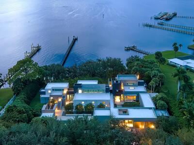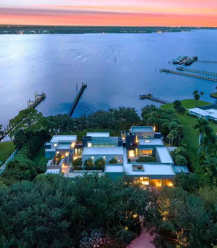 Set on an expansive double riverfront lot, this extraordinary residence boasts over 200 feet of protected shoreline, ensuring privacy, tranquility, and an intimate connection to nature. With unobstructed, sweeping views of the St. Lucie River, the home serves as a front-row seat to the spectacular beauty of panoramic sunsets that transform the sky into a canvas of vibrant colors each evening. This 7,500 sq ft modern masterpiece is a harmonious blend of cutting-edge design and the serene allure of waterfront living. Its striking architecture and floor-to-ceiling windows frame the river from nearly every angle. The residence radiates contemporary elegance while remaining firmly rooted in the natural beauty of its surroundings.