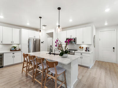 Sophisticated and modern, this 3-bed, 2.5-bath end-unit townhouse in the gated Enclave at Mangonia Park delivers ultimate comfort! The two-story residence welcomes you with high ceilings, abundant natural light, and a seamless open-concept design. The chef-inspired kitchen features stainless steel appliances, sleek countertops, and a pendant-lit island. Upstairs, a versatile loft with a built-in beverage cooler serves as a tranquil retreat. Your primary suite possesses a refreshing ensuite, while the secondary bedrooms share a pass-through bath. A laundry nook and attached 2-car garage add to its functionality. With interstate, the Tri-Rail station, shops, dining, and downtown West Palm just a short distance away, this home offers a relaxing urban lifestyle. Seize the opportunity today!