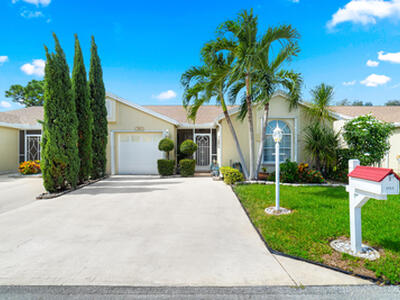 Welcome home! This sunny 1,371 sq ft villa offers 3 bedrooms and 2 baths with a 1-car garage, all wrapped in a light and open layout. Step inside to vaulted ceilings, a kitchen that invites gathering (complete with stainless steel appliances), and plenty of room to move. The living spaces feature tile flooring while the bedrooms stay cozy with carpet underfoot. One of my favorite spots? The screened-in patio, which overlooks a peaceful water view and makes morning coffee or evening relaxing extra special.As part of The Villages of Woodlakes (55+ community), you'll enjoy access to neighborhood lakes, a clubhouse & pool, plus easy access to shopping, beaches, and PBI Airport. This home feels personal, comfortable, and ready for someone to bring their own style. Schedule a showing!