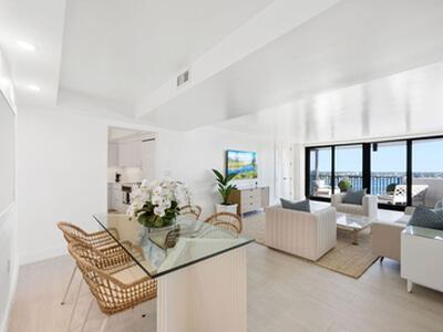 Located directly on the Intracoastal Waterway, this newly renovated two bedroom, two bathroom condominium offers 1,587+\- total square with sweeping views of the Intracoastal, Palm Beach Island, and beyond.The spacious living and dining area opens to a private balcony through floor-to-ceiling glass doors, creating a seamless flow between indoor and outdoor living. The modern kitchen, just off the dining area, combines clean design with everyday functionality.The primary suite includes floor-to-ceiling glass doors opening to the balcony and a beautifully updated en-suite bath. The guest bedroom also enjoys balcony access and a private en suite bath, ideal for family or guests.Additional features include an in-unit washer and dryer and one designated parking space.The Trianon