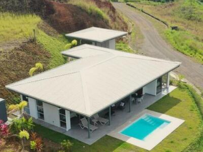 Overlooking the deep blue Pacific Ocean, this 1539 SF home is packed with beautiful details. Expansive windows and doors capture the mountain, garden and incredible ocean views, as well as the pool, just steps from the covered porch. Warm local woods grace the soaring ceilings, as well as custom cabinetry, furniture, doors and closets. Wake up to the sounds of wildlife, birds and monkeys, treasured in Costa Rica. This floor plan provides an open, airy feel, with a connection to the outdoors. Allow the mountain breezes to flow through, while the large tile floors and many ceiling fans cool the house (bedrooms have A/Cs). Adding to the tropical feel, basket lights hang over the kitchen center island, a favorite hangout spot. Fully furnished, this beauty is move-in ready. Enjoy!