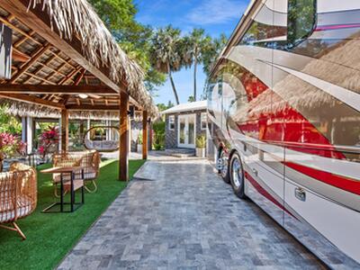 Discover this exceptional Class A Motorhome lot in the luxurious Aztec RV Resort.This phenomenal 6,911 sq.ft. lot feels like your own private resort, designed for luxury outdoor living.Relax beneath a grand 25x25 Tiki with a synthetic palm roof, complete with a custom outdoor kitchen, BBQ, and spacious lounge area.Unwind in the second Zen retreat Tiki, where a fire pit and cascading waterfall set the stage for unforgettable evenings under the stars.A private garage accommodates your car and golf cart, while a guest house offers every comfort a'' bathroom, shower, Murphy bed, washer/dryer, and A/C.Every detail has been crafted to perfection and is sold fully furnished to the highest standard. Just bring your suitcase and start living the dream !
