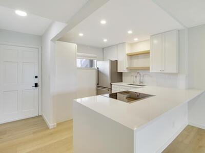 Step into modern elegance in this gorgeously remodeled 2-bedroom, 1-bathroom residence overlooking serene lake views in the sought-after Lake Clarke Gardens community. This home shines with a completely reimagined interior featuring brand-new stainless-steel appliances, soft-close shaker cabinetry, open shelving, and sleek quartz countertops that set a clean, coastal tone. The spacious living areas are enhanced by natural light and light-oak flooring, creating a bright, inviting ambiance that flows seamlessly from kitchen to living room.The spa-inspired bathroom is a true retreat with polished marble-style tile, a frameless glass shower, and elegant finishes throughout.