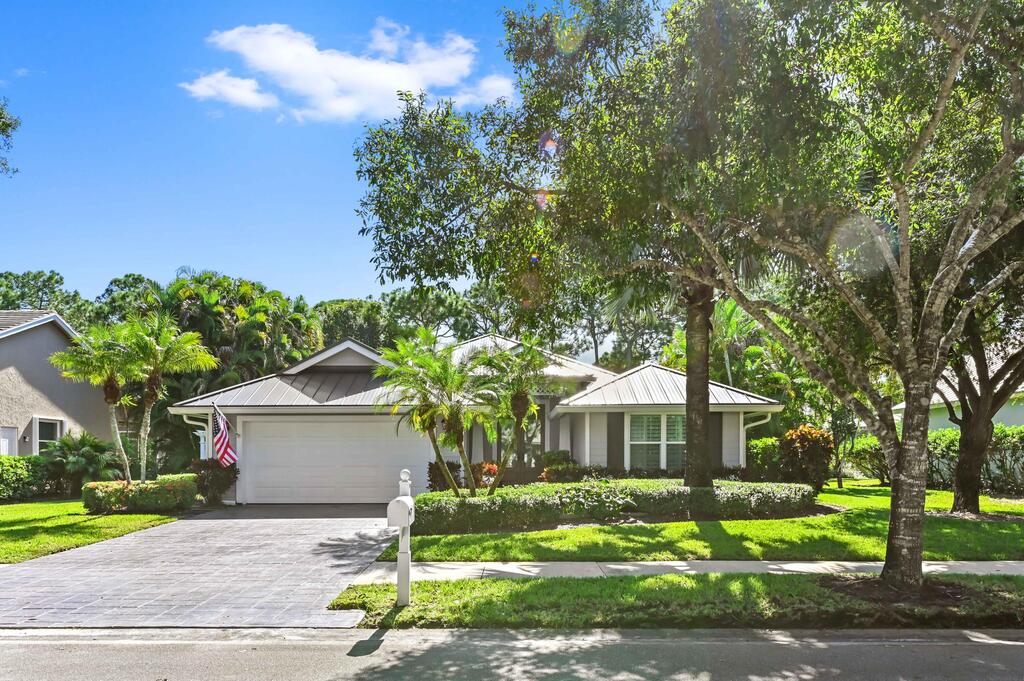 Prepare to be captivated by this stunning, custom-designed single-family pool home, perfectly situated in a desirable Hobe Sound community. The residence exudes charming curb appeal, featuring a modern metal roof, impact windows, a stylish stamped concrete driveway, and lush tropical landscaping that frames the home. The covered front entry features elegant columns and handsome double entry doors with unique dark hardware, setting a sophisticated tone from the moment you arrive.